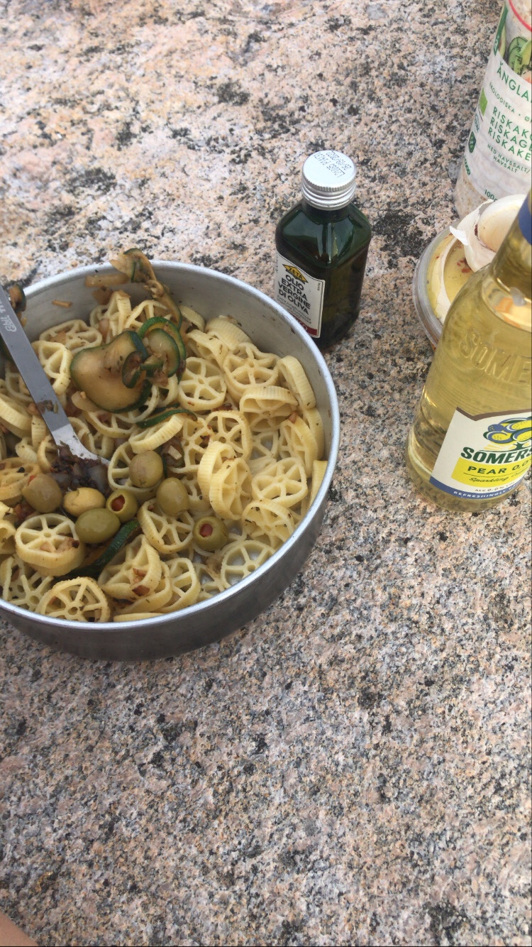 Ich fange heute einfach mal mit dem Abend an, denn daran kann ich mich momentan am besten erinnern. Unsere Unterkunft ist direkt 200 m von einem wunderschönen Strand entfernt. So haben wir heute Abend den Gaskocher eingepackt und haben am Meer Nudeln gekocht (man beachte die Form der Nudeln 😉 ). Es war total schön, auf den warmen Steinen der steinigen Küstenlandschaft zu sitzen und stolz auf den Tag zurückblicken zu können.